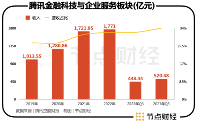 財報顯示,2023年Q3,其金融科技與企業服務收入520.5億元,同比增長16%,遠高於集團整體營收增速爲10%;同期,金融科技與企業服務收入佔總營收比重爲34%,連續十個季度突破30%,妥妥碾壓網絡廣告,成爲遊戲之後的創收中樞。