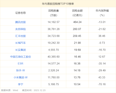 數據顯示,截至2023年12月25日,港股年內的回購總額已超過1222億港元,創下歷史新高。其中,騰訊控股和友邦保險2023年年內分別回購約464.2億港元、280.1億港元,佔據回購榜前兩位。總體看,港股2023年回購額較爲集中,Top3公司回購額在港股總回購額中的佔比約80%。