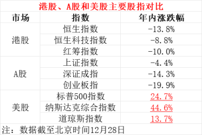 截至12月28日,恆生指數年內下跌13.8%,恆生科技指數下跌8.8%,紅籌指數下跌10%;美股三大指數均錄得超13%的漲幅,納斯達克綜合指數更是漲幅達44.6%,與港股和A股相比,實在是耀眼。