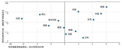 全球主要國家年化每股淨收益增長與平均淨資產收益率的表現