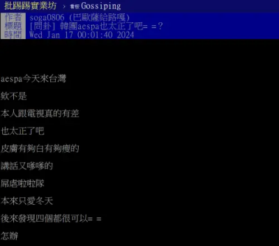 ▲原PO分享見過aespa本人的感想。(圖/翻攝自PTT) 貼文一發布,引起網友熱烈討論,「韓國連啦啦隊來台灣都直接打趴台灣藝人」、「水管有人放影片了啊」、「真人AI,真D漂亮」、「每日告白金冬天」、「寧寧有讓我嚇到,真的變好正」、「Winter我婆」、「寧寧是中國人,語言構通沒問題,可以去把她了」、「Karina超讚」、「這團是真的有實力啦!不用懷疑」!
