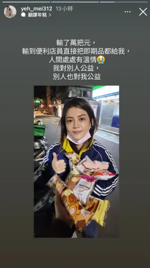 ▲葉欣眉也買刮刮樂來試手氣,希望能中獎。(圖/翻攝自葉欣眉IG)葉欣眉昨天花了2萬5千元,購買了整本面額1000元的刮刮樂,但因彩券行太多人,她就到隔壁便利商店一張一張刮,未料結算時慘賠上萬元。一旁超商店員見她慘賠,急忙拿出店裡即期品送她,超商店員超暖貼心舉動,讓她在IG上感動大喊:「人間處處有溫情。」