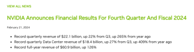 財報顯示,2024財年,英偉達營收609億美元,同比增長126%,淨利潤297.6億美元,同比增長581%。其中,Q4實現營收221億美元,同比增長 265%;淨利潤122.85億美元,同比增長769%。