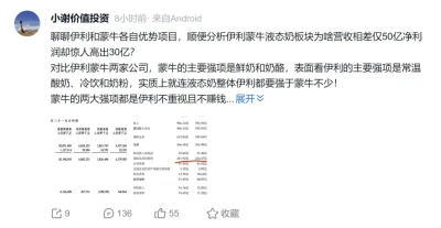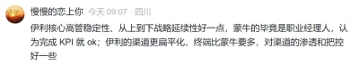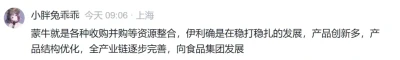 在此基礎上,有雪球用戶認爲,蒙牛是各種收購並購進行資源整合,伊利則是穩扎穩打的發展,產品創新多,高管也更穩定,從上到下的战略延續性更好。