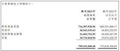 同時,來自主營業務燃料電池系統的營收也比2022年有所下降,該板塊營收佔比則由2022年的92.82%下降到2023年的89.6%。
