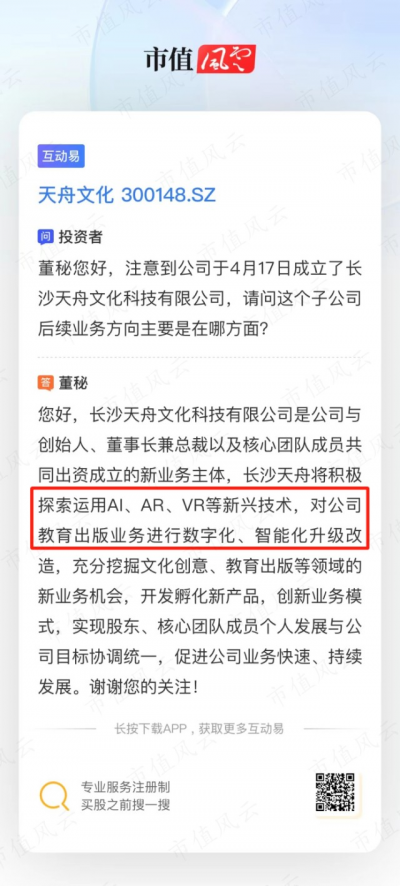 (天舟文化互動易回復,來源:) 難道所謂的“AI命題、高考試題AI預測”,就是上市公司思考多日的結果? 當然不止如此。 同一日,董祕還表示公司與創始人、董事長兼副總裁及核心團隊成員共同設立的長沙天舟,將運用AI、AR、VR等新興技術,對教育出版業務進行數字化、智能化升級改造。