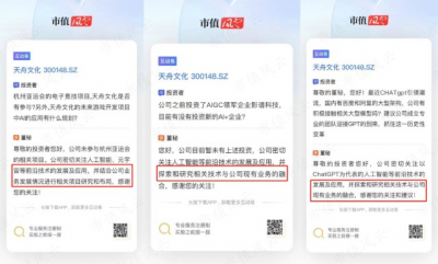 董祕玩轉互動易,又是熟悉的套路 其實就在一個月前,天舟文化的董祕還是另一副說辭,在互動易回復是表示,公司暫未投資新的AI+企業。