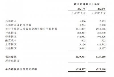 於往績記錄期間,公司分別於2021年及2022年錄得虧損及全面开支總額爲人民幣539.4百萬元及人民幣725.2百萬元。其中絕大部分虧損均來自行政开支、研發开支及按公平值計入損益的金融負債公平值虧損。