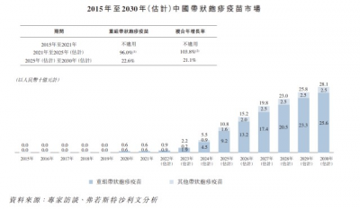 按銷售收入計,中國的帶狀皰疹疫苗市場從2015年的零增至2021年的人民幣6億元,並預計從2021年至2025年按103.8%的復合年增長率增長至2025年的人民幣108億元, 以及從2025年至2030年按21.1%的復合年增長率進一步增長至2030年的人民幣281億元。