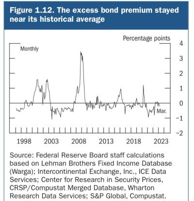 【The excess bond premium 是指企業債券收益率與相同期限的國債收益率之間的差額,超過了企業債券的預期違約風險所能解釋的部分。換句話說,它是指企業債券投資者要求的額外補償,以承擔企業債券市場的流動性風險、信用風險、稅收風險等非違約因素。The excess bond premium 可以作爲企業債券市場的投資者情緒或風險偏好的指標,反映了市場對未來經濟和金融狀況的預期。The excess bond premium 的變化會影響企業債券的需求和價格,進而影響企業的融資成本和投資決策,從而對實體經濟產生影響。上圖反映實體經濟預期不強勁,風險偏好較弱】