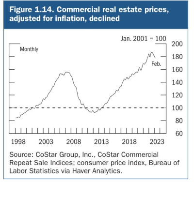 同樣,商業房地產(CRE)估值仍接近歷史高位,盡管CRE細分市場普遍出現價格下跌。