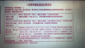 至於6月14日要親自出席股東會的股東,紀念品發放至上午10點半或會議結束為止,紀念品不郵寄,也不會補發。至於這次股東會乙重特別股股東無表決權,也不發紀念品。
