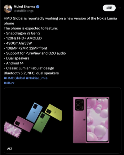 在規格方面,預計是一款中高階機型,據傳搭載高通 Snapdragon 7s Gen 2 處理器,並且有 120Hz 更新率的 OLED 螢幕、4900mAh 電量搭配 33W 快充,雙立體聲喇叭,甚至還有一億畫素的主鏡頭,將搭配 Nokia 的 PureView 技術以及來自於 OZO 的音效支援。