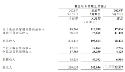 2023年第一季度淨營收爲243億元人民幣(美元)135億),比4年第一季度增長1.4%。2023年第一季度服務收入爲人民幣474億 元(69億 美 元),較2022年第一季度增加34.5%。2023年第一季度,較2022年同期,商品收入減少4.3%,服務收入增加34.5%。