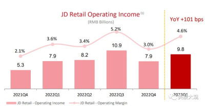 2023年第一季度經營利潤爲人民幣64億元(9億美元),去年同期爲人民幣24億元。2023年第一季度非美國通用會計准則下2 經營利潤爲人民幣79億元(11億美元),2022 年第一季度爲人民幣47億元。2023年第一季度,京東零售不含未分配項目的經營利潤率爲4.6%,2022年第一季度爲3.6%。
