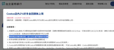 我是廣告 請繼續往下閱讀 針對好市多聯名卡,原本台北富邦銀行提供新戶辦卡滿額享500元好多金、會員續約則有200元好多金,指定消費可依刷卡額享0.5%至3%不等的好多金,其中Costco店內消費2%回饋無上限,店外一般消費也有1%好多金回饋無上限,而且分期也能享有回饋。
