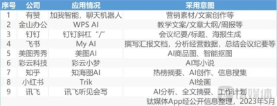 據我們不完全統計,目前已經有有贊、金山辦公、釘釘、飛書、美圖秀秀、知乎、彩雲科技、訊飛聽見等諸多軟件選擇引入大模型來向用戶提供服務。