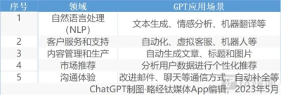 在上述落地場景中,這些先行試用的企業大多使用GPT進行AI創作、素材/圖片生成優化等方面的工作,爲了避免方向的局限性,關於還有哪些領域最先將GPT引入業務流,我們也詢問了ChatGPT(开源版本),並讓其繪制成了表格。