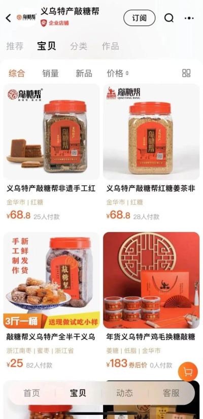 淘寶上有個名爲“敲糖幫”的店鋪,賣的是義烏當地特色紅糖、姜糖,相比動輒上百萬粉的大店,只有6萬粉絲的敲糖幫只能算是小店。