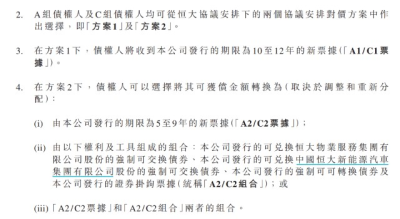 此外,中國恆大也將協議安排債權人可以選擇將其可獲償金額轉換爲:一,期限爲5-9年的將由中國恆大發行的新票據;二,由五筆與恆大物業、恆大新能源汽車或中國恆大上市股票掛鉤的股權掛鉤票據構成的組合,掛鉤方式包括由其擔保、掛鉤、可強制交換或可強制轉換對應股票;三,上述兩者的組合。