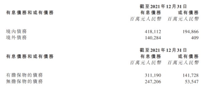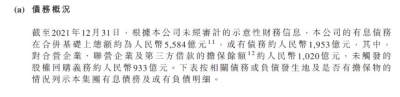 而根據公告,恆大未經審計的示意性財務信息顯示,截至2021年12月31日,公司的有息債務在合並基礎上總額約爲5584億元,或有債務約1953億元,僅境內外有息及或有債務總額就高達7537億元。其中,對合營企業、聯營企業及第三方借款的擔保余額約1020億元,未觸發的股權回購義務約933億元。