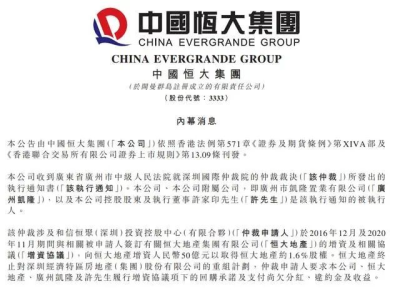 中國恆大5月12日發布公告稱,公司收到廣東省廣州市中級人民法院就深圳國際仲裁院的仲裁裁決所發出的執行通知書。本公司、本公司附屬公司,即廣州市凱隆置業有限公司,以及本公司控股股東及執行董事許家印是該執行通知的被執行人。
