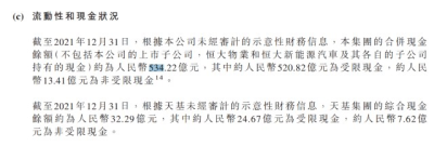 據中國恆大今年3月22日發布的公告顯示,恆大集團現金余額(不包括恆大集團的上市子公司、恆大物業和恆大汽車及其各自的子公司持有的現金)約爲534.22億元,僅13.41億元爲非受限現金;天基集團的綜合現金余額約爲32.29億元,7.62億元爲非受限現金。恆大的可支配現金僅有21.03億元。