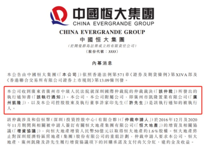 中國恆大、中國恆大附屬公司廣州凱隆、以及中國恆大控股股東、執行董事許家印爲該執行通知的被執行人。