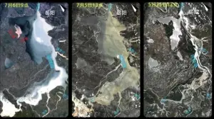 ▲衛星照曝光洞庭湖潰堤前後湖水大範圍漫溢災情狀況。(圖/翻攝自微博)此外,中國陸地觀測衛星數據中心還發布了團洲鄉周邊5月25日13時、7月5日13時、7月6日9時前後影像,顯示了洞庭湖近期在上遊支流超警洪水不斷湧入,水面面積不斷擴大的過程以及決堤後洪水覆蓋村莊情況。