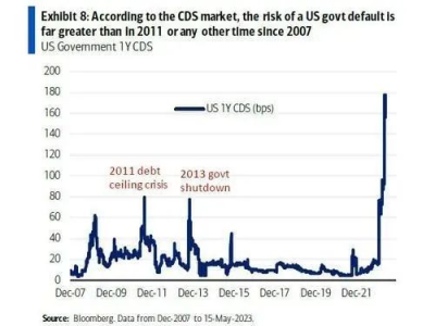 美國政府CDS暗示違約風險的概率遠高於自2007年以來的任何時候。