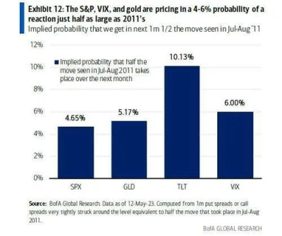 “廉價彩票”,买還是不买? 通過對比期權價格,美銀發現,標普500指數、波動率指數(VIX)和黃金定價暗示發生類似2011年危機的概率爲4-6%,僅爲當年危機爆發前兩個月的一半。