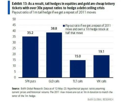 按照美銀分析師的說法,投資者對長期債務上限僵局的威脅漠不關心,使得一些尾部風險策略變得十分便宜,因此無法令人放棄。美銀估計,現在买進標普500指數期權和黃金期權的回報率分別爲35倍和39倍。
