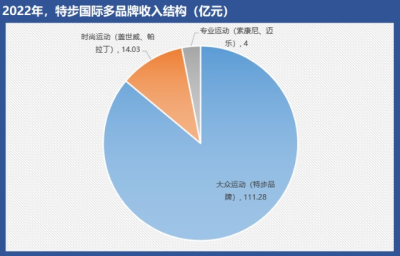 2022年,特步品牌收入111.28億元,佔公司收入比高達86.1%,蓋世威、帕拉丁品牌合計收入14.03億元,佔公司收入比爲10.8%,索康尼、邁樂品牌合計收入4億元,佔公司收入比只有3.1%。