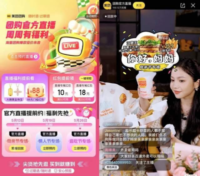 抖音生活服務進一步深入战場的同時,行業龍頭美團也“反向”做起了外賣直播,推進內容化進程。近期「真探」注意到,五月份共有三場美團團購的官方直播活動,分別是5月11號的母親節專場,5月19號的情人節專場和5月26日的逛喫節專場。