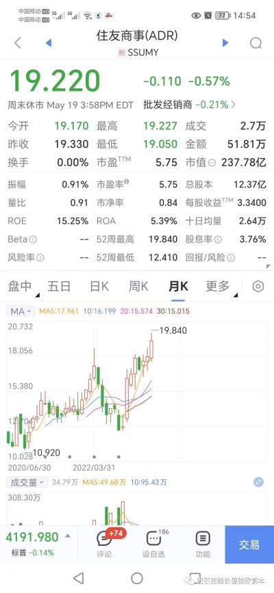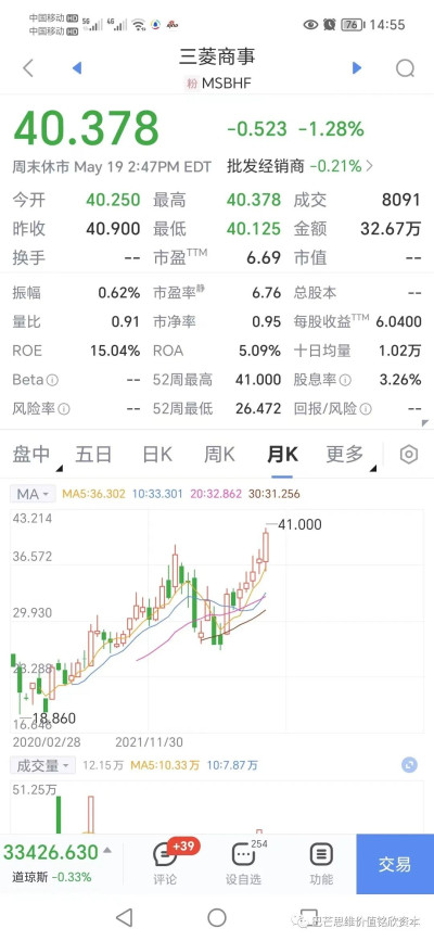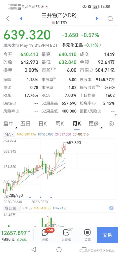 當時除了伊藤忠商社以外,其他四家公司的股價都低於账面價值。近三年來,這五家商社的股價和業績表現出色。丸紅商事股價漲逾兩倍,三井物產、三菱商事股價翻了一番以上。