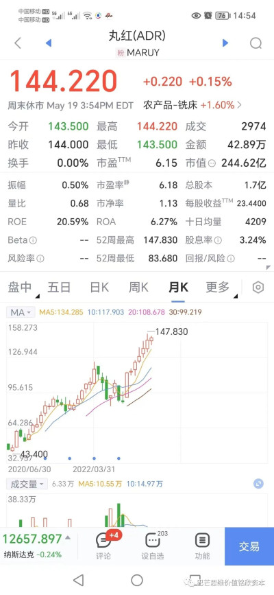 華麗家族屬於房地產开發公司,2022年全年營業收入近2.1億元,淨利潤7648萬元(這是真的嗎 大家相信淨利潤真有這樣?)。2023年一季度只賣出了300平米的房子,營收僅有1046萬元,歸母淨利潤還虧損了1247萬元。華麗家族5月18號市值55億元,市淨率1.48倍。這個估值是太高了 可以說是天花板的高!