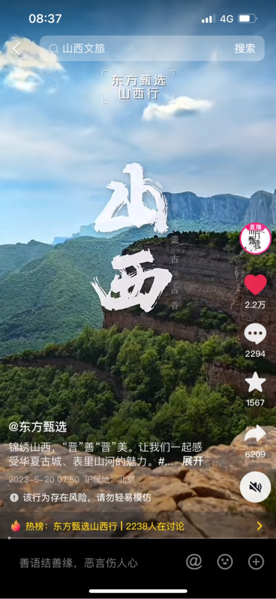 山西專場大號漲粉接近10萬,總粉絲突破3000萬,單日場觀2600萬,GMV超過浙江專場2日GMV總和,熱度回到了去年底的狀態。在直播中最讓人感動的是山西人民的熱情,以及全國人民通過直播間對山西有了全新的認識,這就是甄選的力量。這次直播銷量前三的產品分別是汾酒、平遙牛肉和寧化府的醋,讓山西的優質產品走進更多的中國家庭。從今天开始的5天,俞老師會帶領董宇輝,明明,中燦在看世界山西深度遊,繼續向抖音的朋友們介紹山西的歷史文化和名勝古跡。
