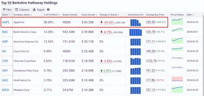 根據最新披露的13F文件顯示,截至二季度末,股神巴菲特所在的伯克希爾共持有36家公司,美股持倉價值爲2799.69億美元,較一季度末下降約521億美元。