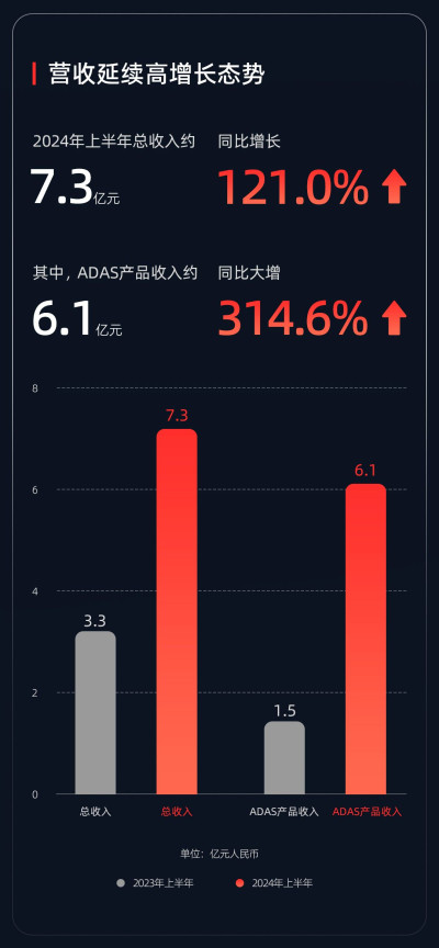 財報顯示,速騰聚創今年上半年總收入7.27億元(人民幣,下同),同比增長約121.0%,增速遠超全球同行。其中,用於ADAS應用的激光雷達產品收入約6.1億元,同比增長314.6%。