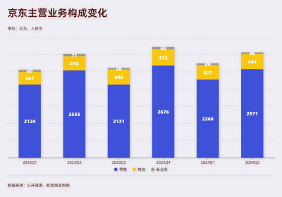 相比去年同期,京東目前主要業務只有零售(包含健康)、物流,此外,達達、產發、京喜和海外業務被歸類爲“新業務”。這三項業務中,京東零售2571億,同比增長1.5%;物流442億,同比增長7.7%;新業務46億,同比大幅下滑35%。