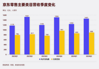拆解京東零售,主要拖累增長的反而是3C業務。作爲京東起家的根本,二季度電子產品及家用電器業務收入1451億,同比下滑了4.6%。與之相比,日用百貨反而起到了正向作用,二季度888億營收,同比增長8.7%。