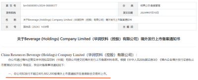 今年4月,港交所官網披露了華潤飲料的招股書。7月,證監會官網發布了華潤飲料境外發行上市備案通知書,其中備案事項包括華潤飲料擬發行不超過4.06億股。