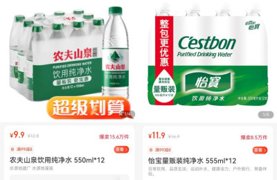 而怡寶的純淨水(550ml*12瓶)也從16.9元打折至11.9元,同樣每瓶單件已低至不足1元。