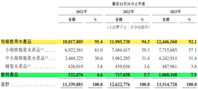其中,包裝飲用水產品的收入收入佔比在92.1%—95.4%之間,盡管收入佔比期內逐年微降,但收入金額持續上升,從108.2億元增至124.5億元。