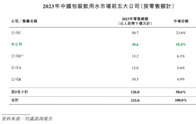 灼識咨詢報告顯示,按2023年零售額計,在包裝飲用水市場,農夫山泉以507億元零售總額,佔有23.6%的市場份額,高居榜首;華潤飲料排名第二位,市場份額約爲18.4%。
