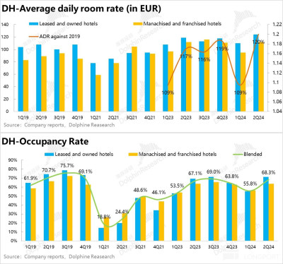 相比之下,歐洲的酒旅需求因爲歐洲杯和三季度內奧運會的帶動效應下,出現了一波明顯的拉升。平均單間收入(RevPAR)達到了 19 年同期水平的 115%,創下疫情以來的歷史最高。不過畢竟規模有限,對集團整體的影響不大。