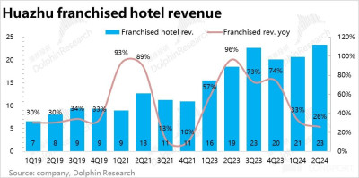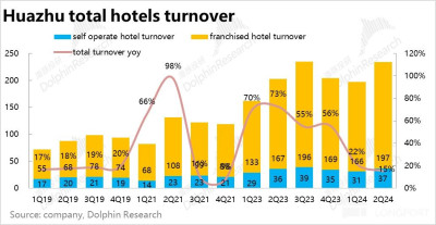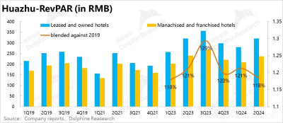 華住直營業務,因酒店數量淨減,收入增速僅剩 2%。但加盟業務的營收仍保有同比 26% 的增速,雖也在環比降速但依舊不俗。且相比流水 18% 的增速更高,換言之,華住在加盟業務中變現率也是提升的。