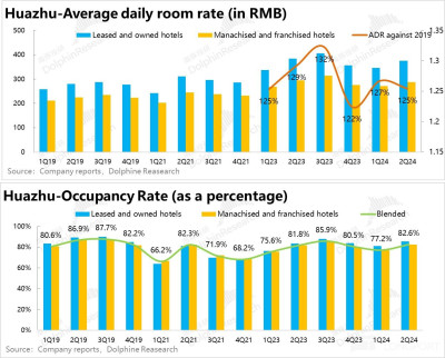 1、底層經營數據上,二季度華住酒店平均單間收入爲 296 元/夜,同比下降 2.4%。可見酒旅供需的景氣度在近幾個季度確實在平緩走低。價量驅動來看,本季度客單價相比去年下降了約 3%。入住率則爲 82.6%,高於去年同期約 0.8pct。可見,今年酒旅的需求仍在增長(入住率在增長),但在更理性的消費選擇(也可能有降級)和更均衡的供需下,價格的下滑是導致 RevPAR 走低的主要原因