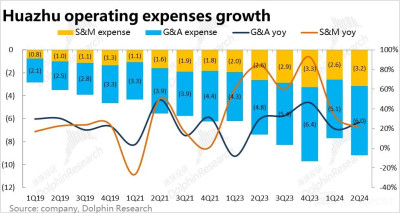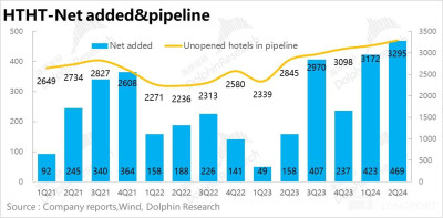 2、盡管近幾個季度供需景氣度有所走低,但華住的开店節奏卻在提速。本季合計淨新开酒店 469 家,相比上季度增長了 46 家。待开業酒店數量接近 3300 家,也比上季增多 120 多家。公司此次也宣布24 年全年开業新酒店的目標由 1800 家上調到 2200 家,明確體現華住要加速开店的意圖。相對逆周期的开店策略,雖邏輯上有助於公司的市佔率,但短期內也可能對盈利產生壓力。