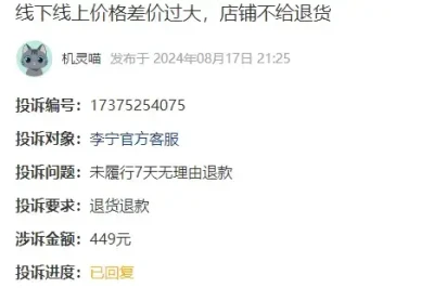 如8月17日,平台過審投訴編號17375254075顯示,一消費者表示,自己在线下實體店購买2雙李寧鞋子,對比後發現,京東APP上的李寧自營官方旗艦店價格僅爲线下特價店一半,线下門店拒絕消費者退貨請求,質疑李寧存在嚴重的霸王條款。